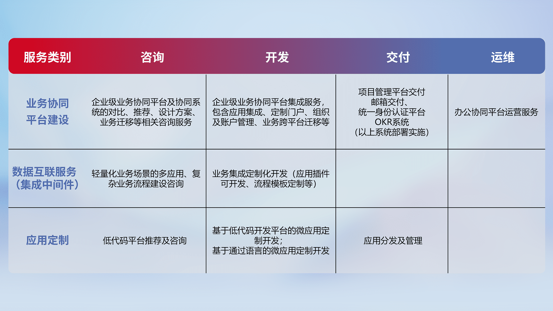 针对钉钉、、、企微、、、IDaas等平台级产品提供产品的规划、、、、方案、、、交付、、定制化开发等服务,,,,实现如统一协同办公、、、智能客户服务、、、混合会议管理、、、智能数据查询、、、、等业务场景,,,实现数字化转型。。。